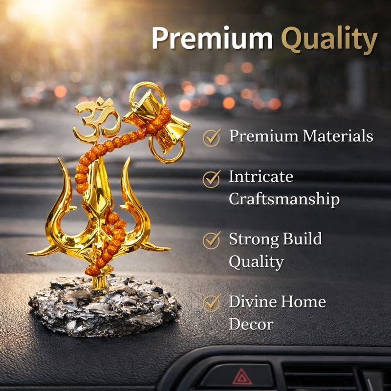 KAVIART Divine Lord Shiva Trishul Car Dashboard Idol with Om & Damru Decorative Showpiece – 11 cm (Resin, Gold)