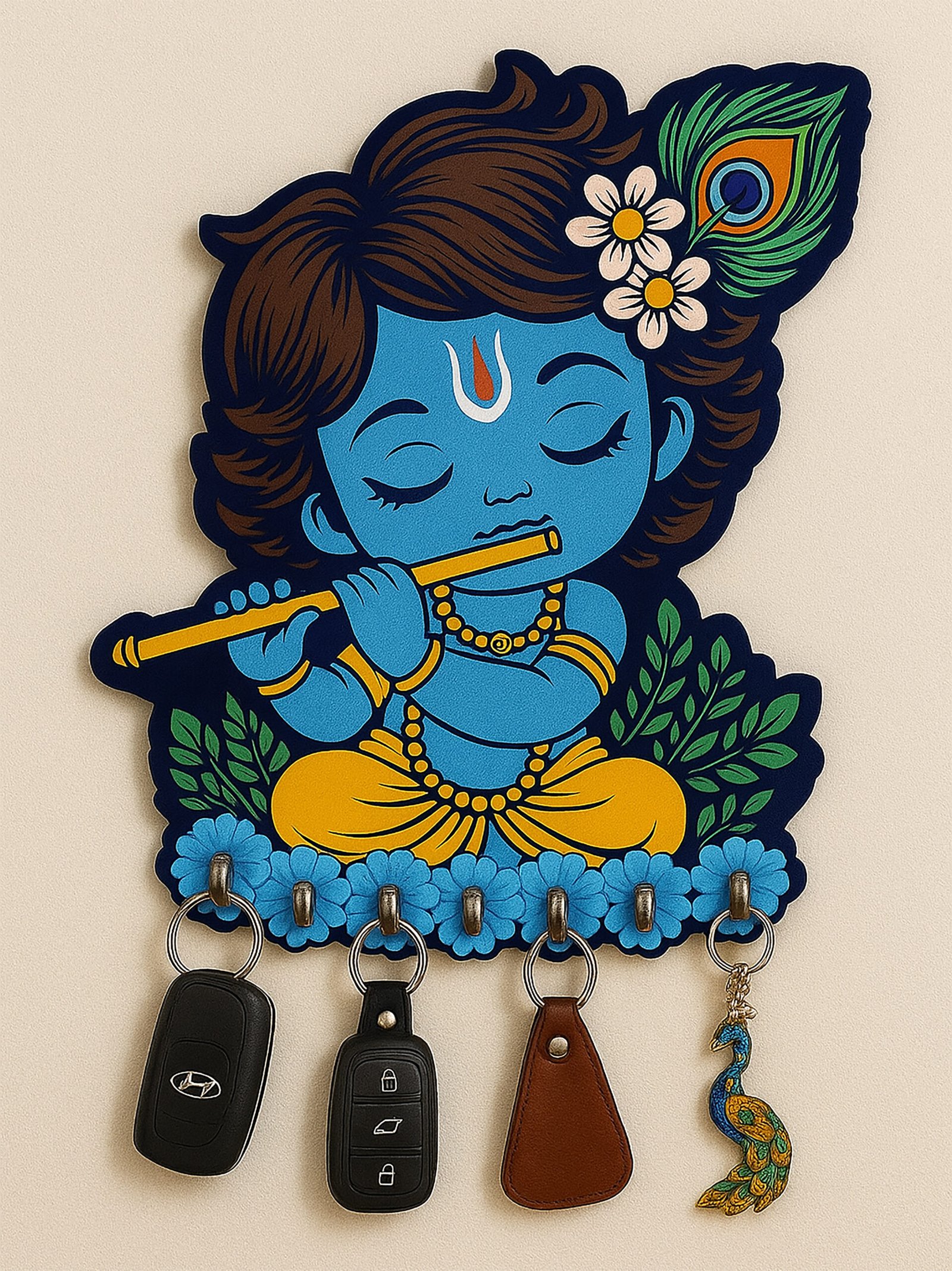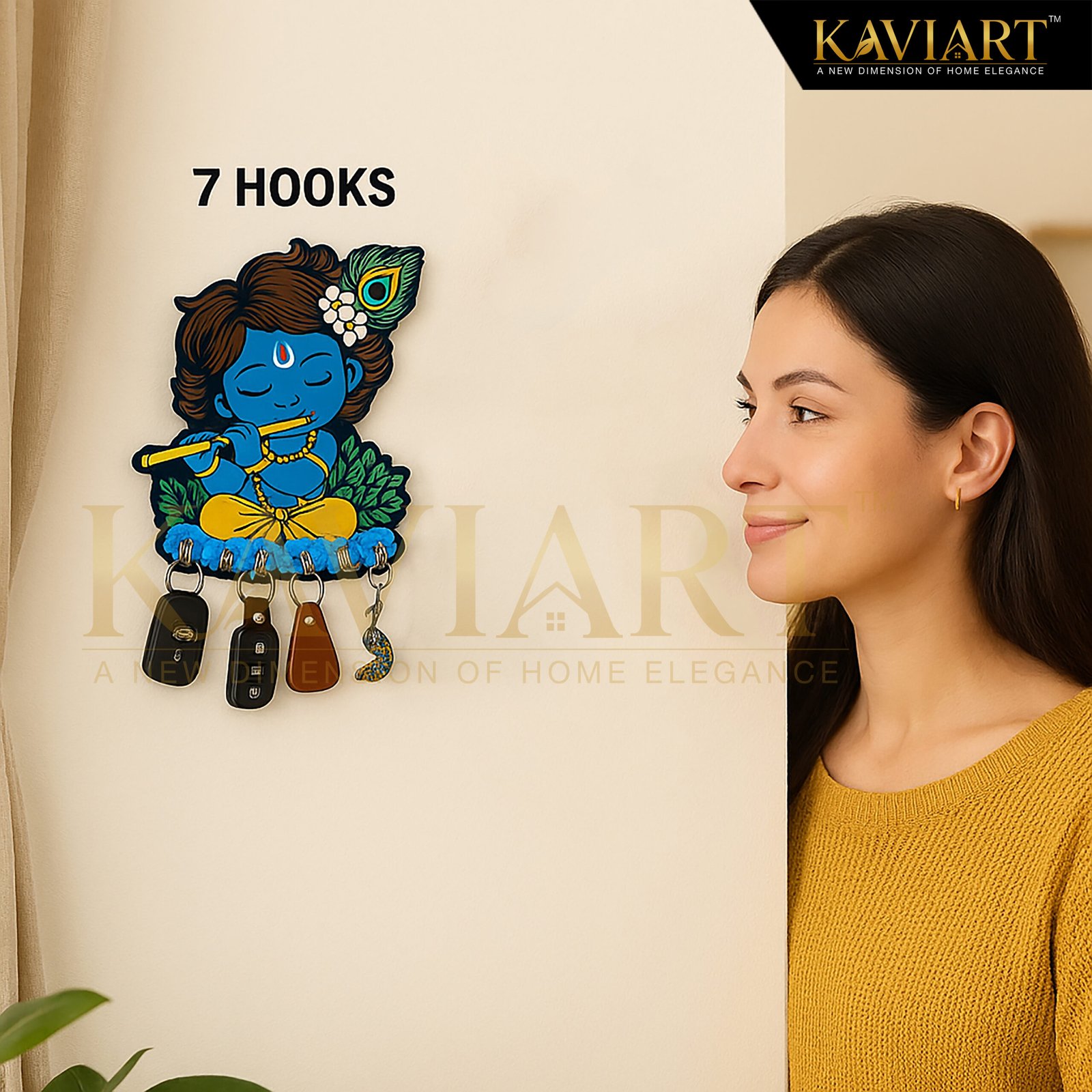 KAVIART Little Krishna Wooden Wall Key Holder Decorative Key Hanger for Home Wood Key Holder (7 Hooks, Multicolor)