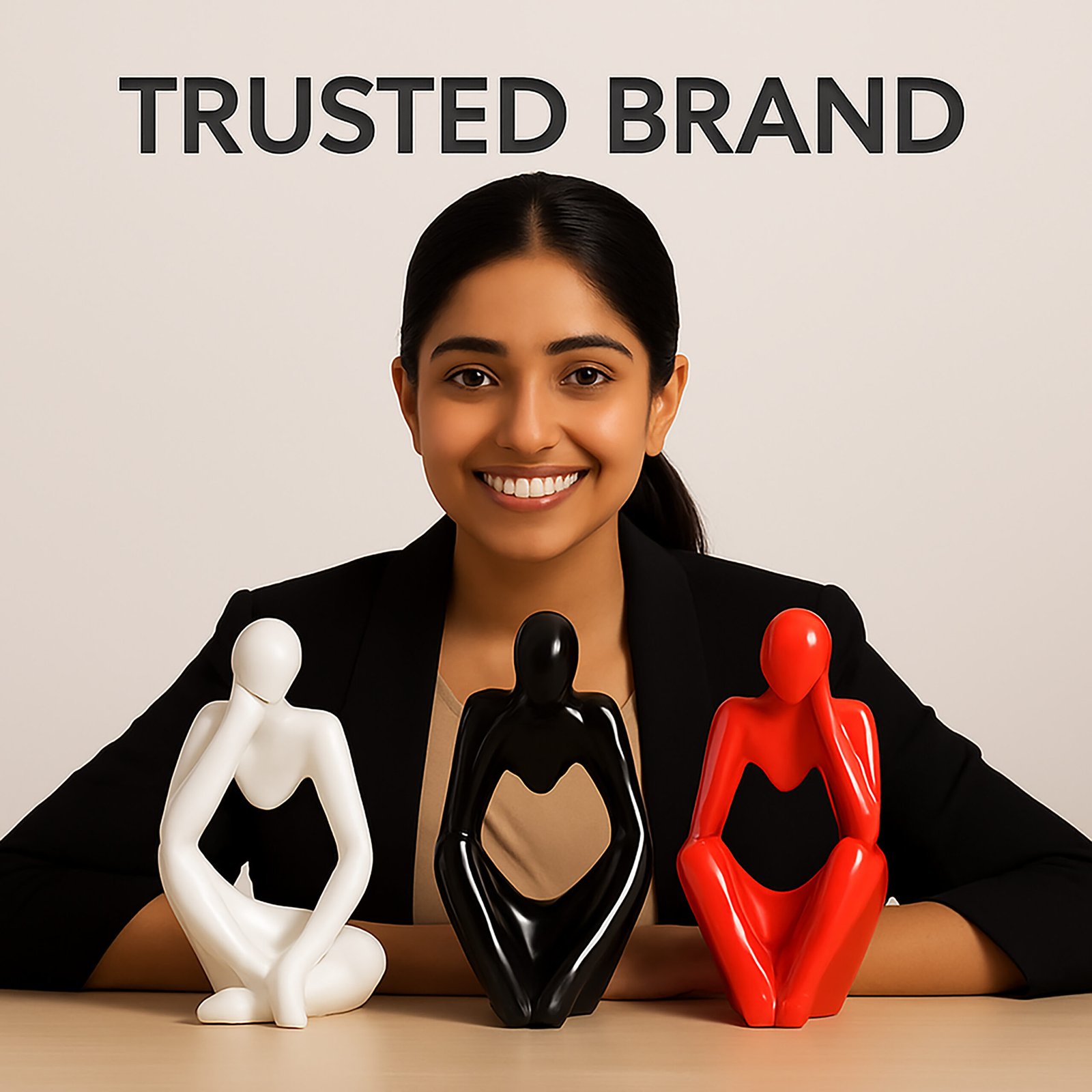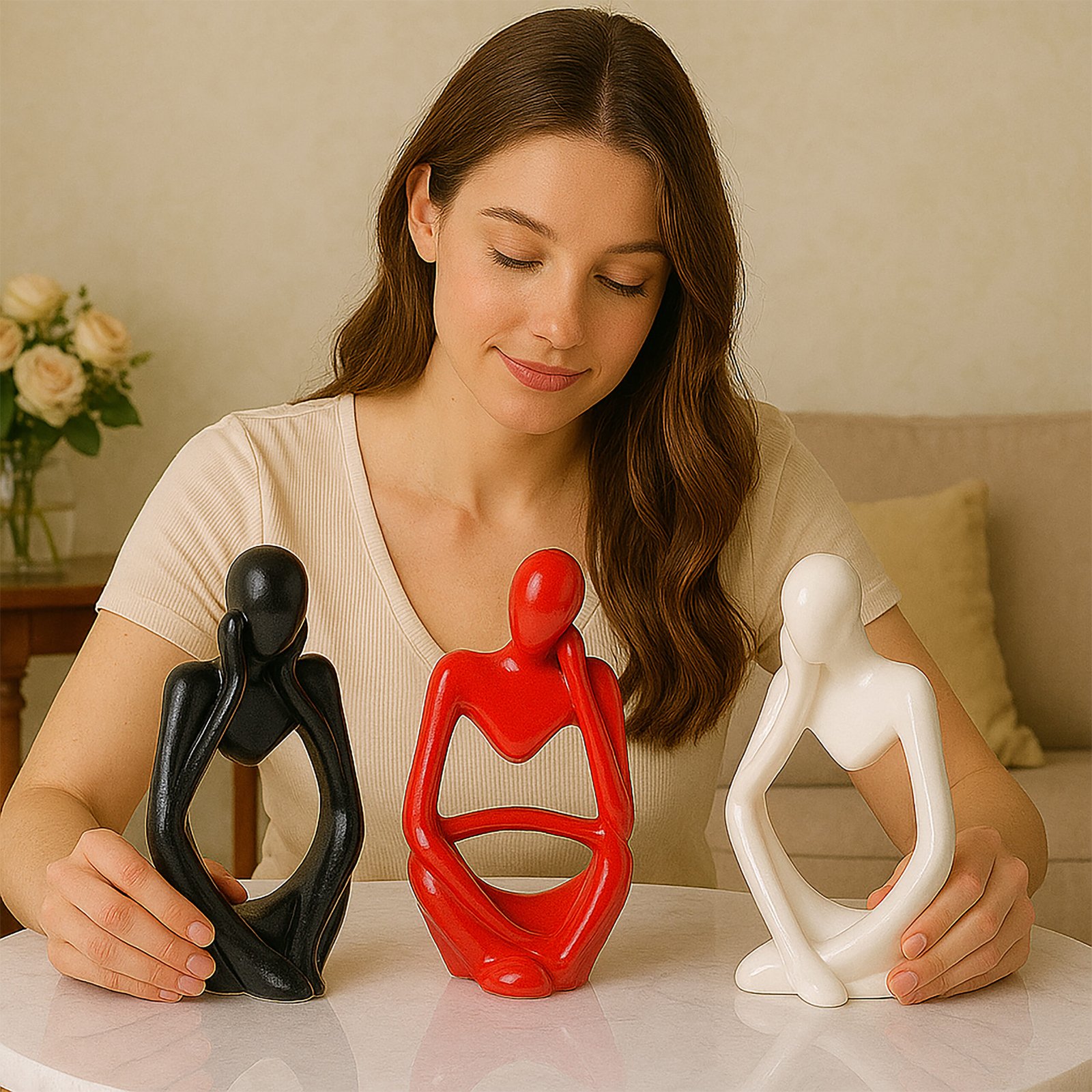 Modern Abstract Design: Stylish thinker men sculptures in black, white, and red add elegance to any space.